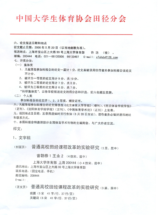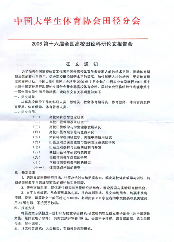2006第十六届全国高校田径科研论文报告会征文通知