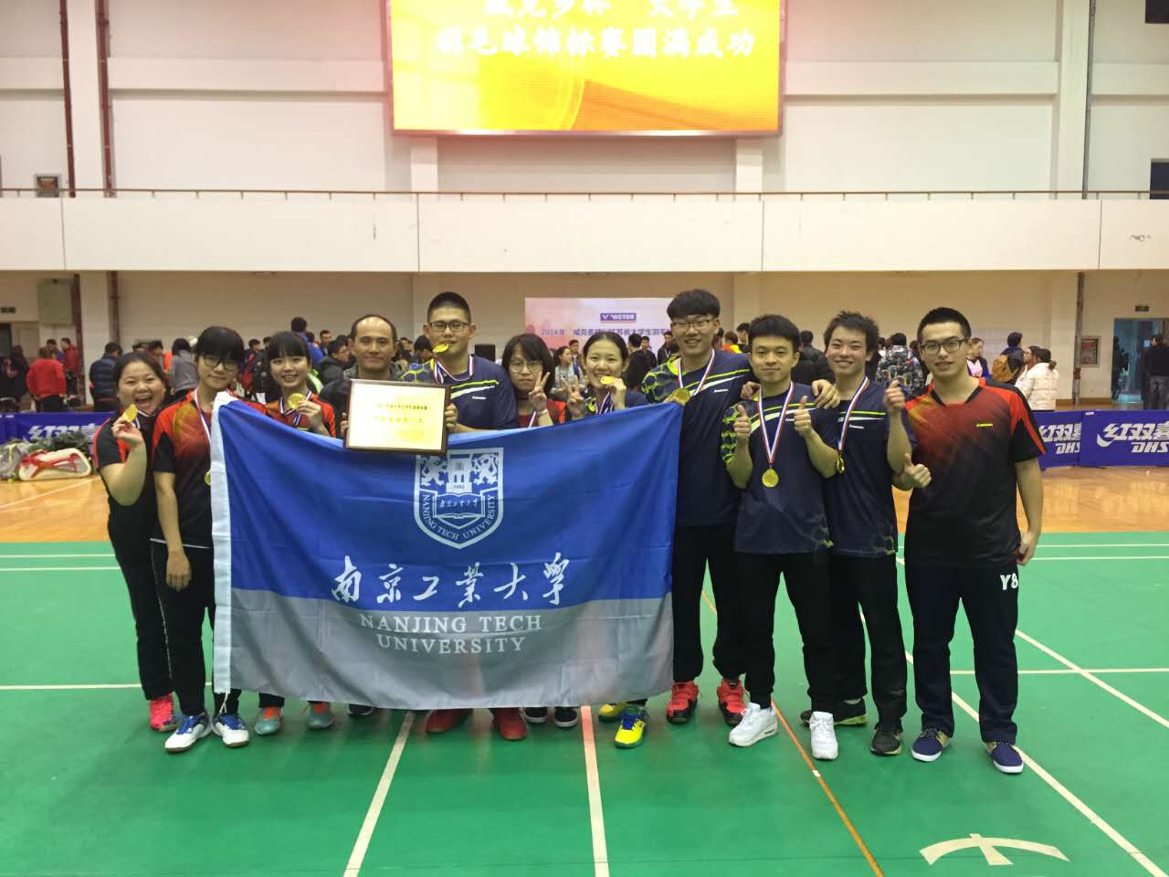 运动场上,选手们认真遵守比赛规则,斗智斗勇、敢拼敢打、一路过关斩将挺进四强。半决赛在大比分0比2落后的不利局面下,最终以3:2顽强逆转常州大学代表队闯入决赛。在历史最好成绩前,全体队员备受鼓舞,斗志十足,以3比1的总比分战胜南京大学代表队捧得团体冠军的奖杯!