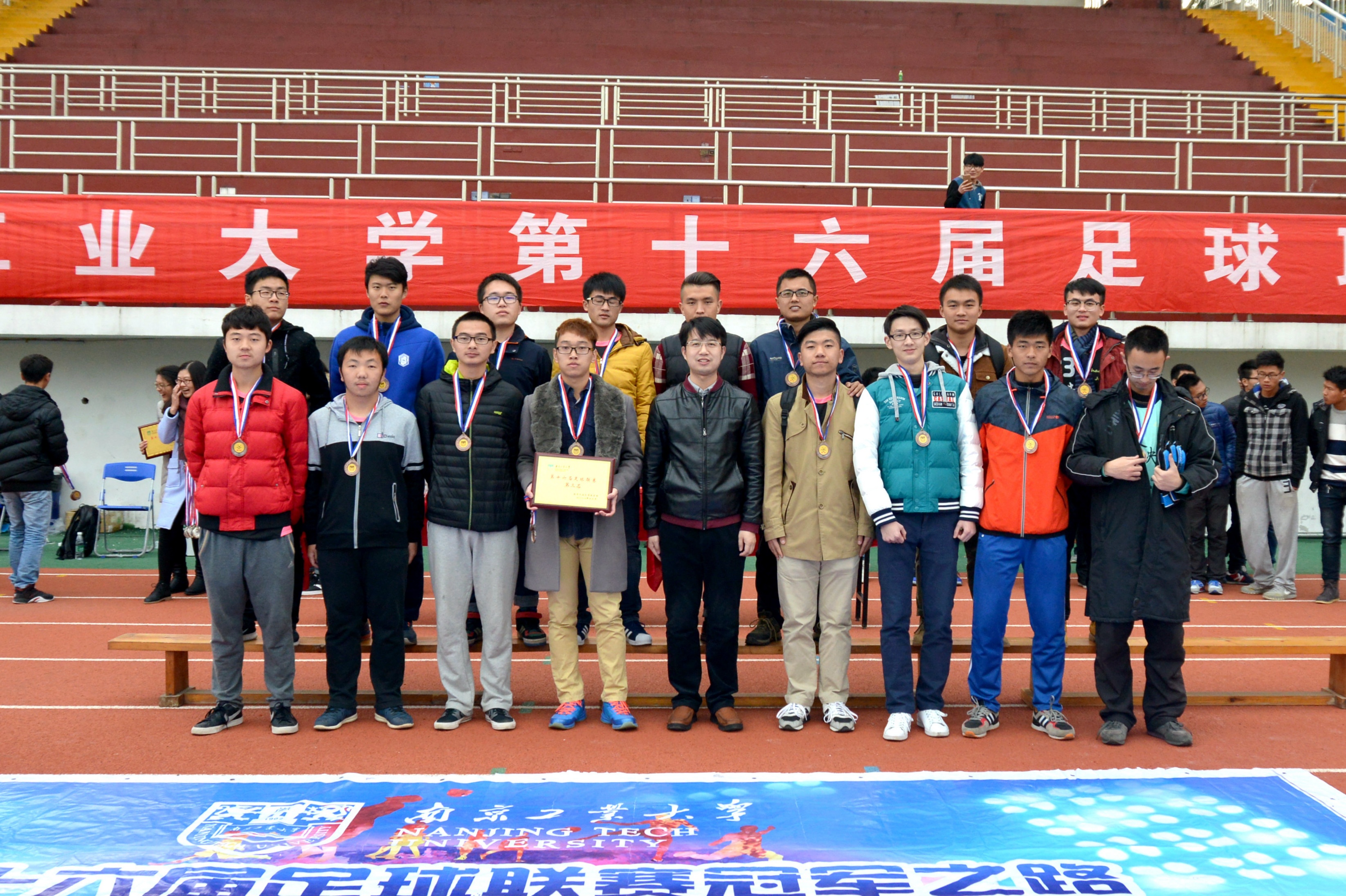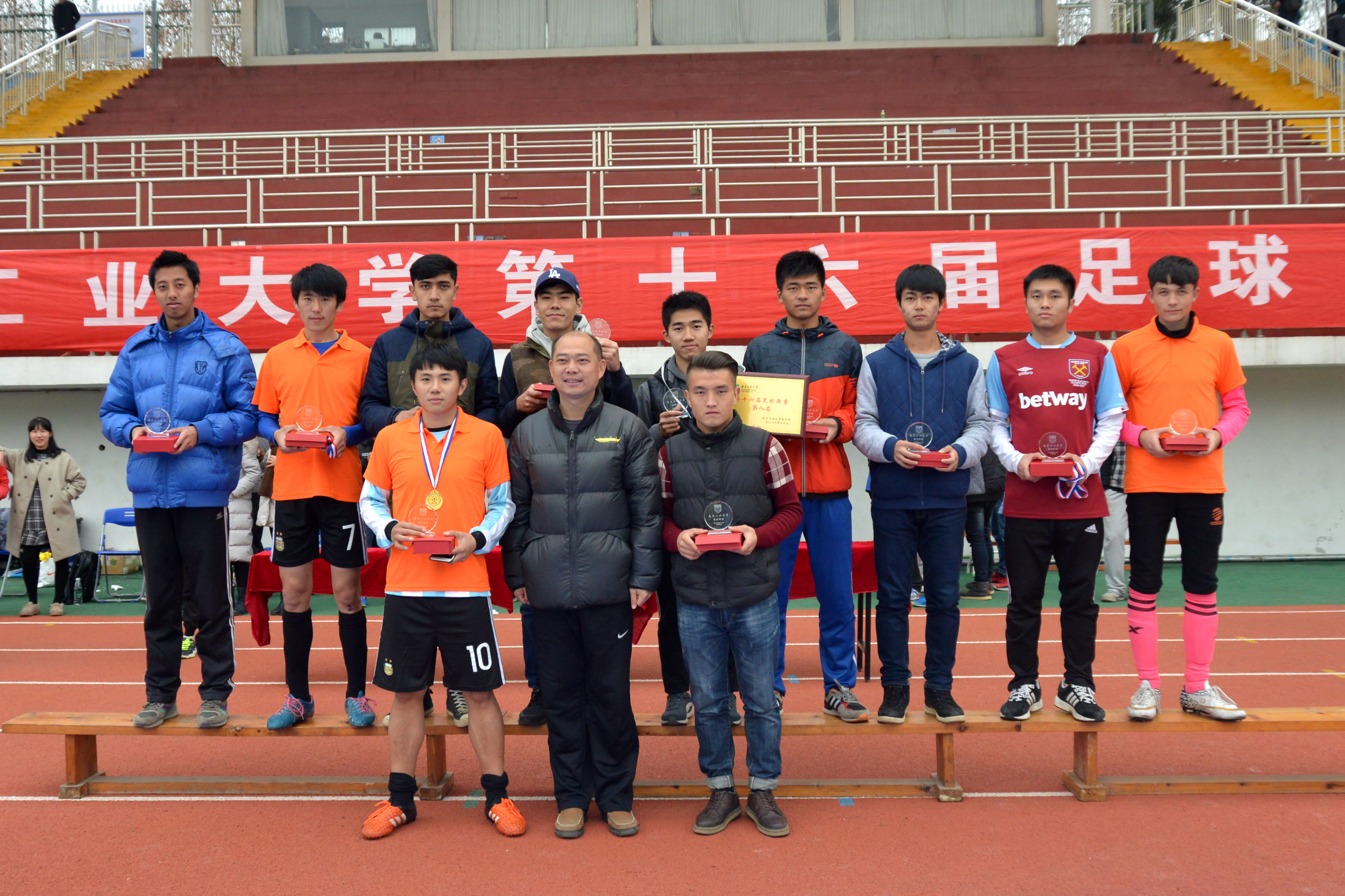 赵飞老师宣布获奖名次分别是第八名为材料学院,第七名为化工学院,第六名为交通学院,第五名为海外教育学院,第四名为土木学院,第三名为机械2011联队,第二名为数理建筑联队,冠军队为经管测绘联队。由赵飞老师为四到八名队伍颁奖。由吴杰老师为季军与亚军颁奖。由陈军老师为冠军队伍颁奖并授予奖杯。同时评出最佳射手努尔江、最佳球员陈嘉伟,由赵飞老师为杰出选手颁奖。最后,陈军老师宣布第十六届足球联赛圆满结束。