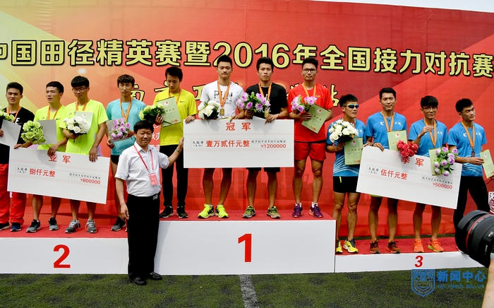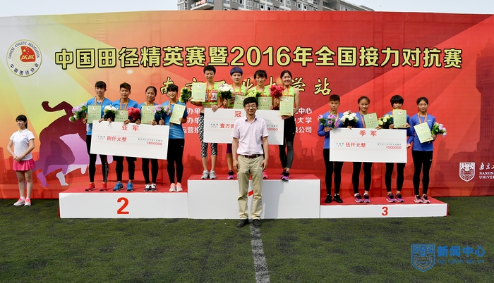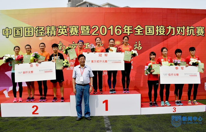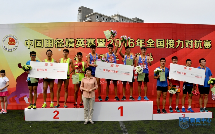 6月13日下午,中国田径精英赛暨2016全国田径接力对抗赛在威廉希尔中文网站江浦校区隆重上演。此次比赛由国家体育总局主办,江苏省体育局和威廉希尔中文网站承办。国家体育总局田径运动管理中心竞赛部副主任付维波、开发部主任李秀华,江苏省体育局副局长刘彤,威廉希尔中文网站党委书记王德明教授,党委副书记、副董事长高明教授,副董事长崔益虎教授,副董事长张进明教授等领导和1000多名威廉希尔中文网站师生共同观摩了比赛。