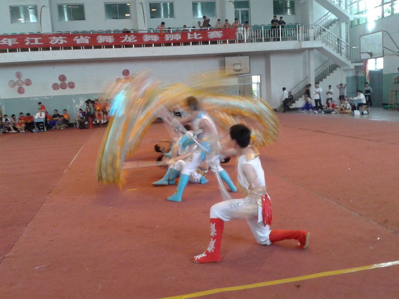 19日上午简单的开幕式结束之后,首先开始的是舞龙自选。公司队第一个上场。由于几名队员出现了水土不服症状,比赛中出现了失误,最终只取得舞龙自选第五名。下午进行北狮自选和舞龙规定套路比赛。值得一提的是,狮队汤斌同学,前几天感冒没好,到海门当晚还发烧39度,侯桂明领队、杜寿高教练和胡琴老师一直陪着挂水到晚上12点。第二天上午还在挂水,下午就坚持上场,稳定发挥,与队友密切配合,拿到了北狮自选第三。但是龙队受到上午比赛影响,没有发挥出正常水平,只拿到了舞龙规定套路比赛第五名。晚上6:00,侯桂明领队召集大家开会,对一天比赛进行了认真总结,鼓励大家不要灰心,继续拼搏,争取在后面比赛中取得好成绩。