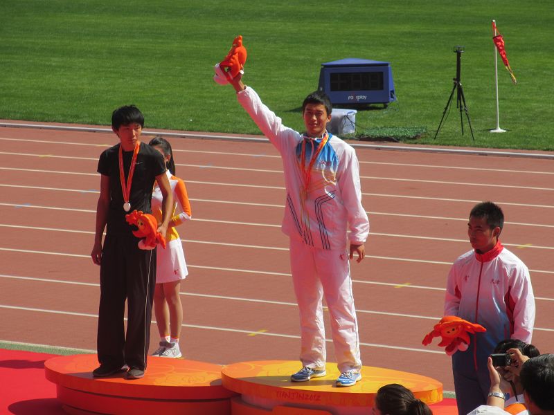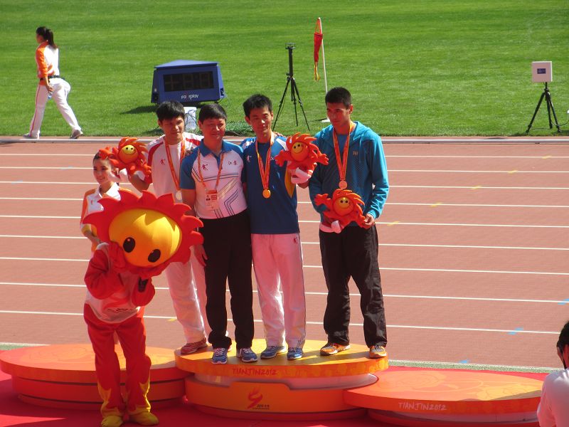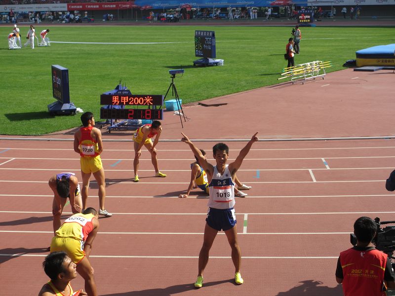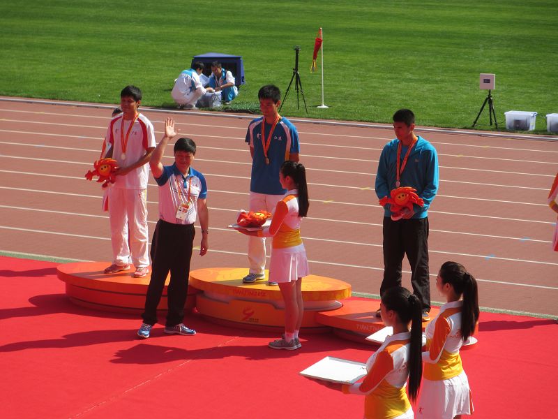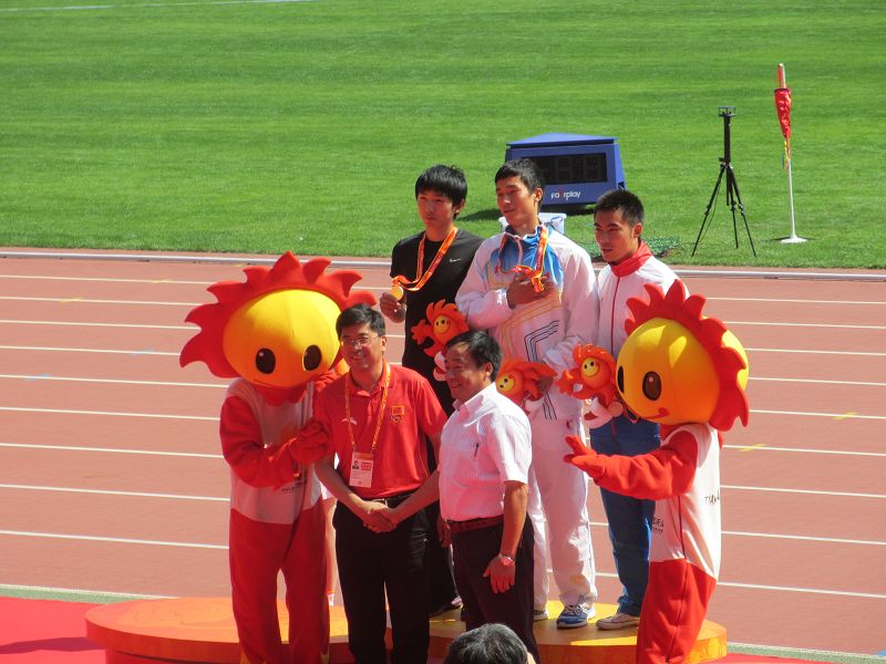 9月16日上午,校田径队运动员王胜亚同学在男子甲组200米决赛中,稳控局势,最后发力,率先为江苏省代表团夺得田径项目甲组首枚金牌;随后田径队队员査松山同学在跳高项目中,战胜众多好手,又以2.18米的优异成绩夺得金牌。江苏省教育厅胡金波副厅长和体育局副局长杨国庆为公司运动员颁奖,给予热烈祝贺和表扬,并与运动员合影!(来自体育部)