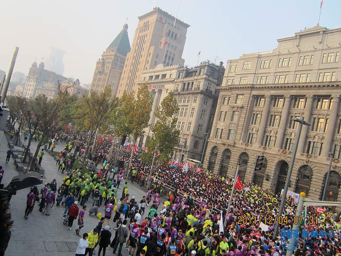 12月4日清晨7时,2011年上海国际马拉松赛在陈毅广场鸣枪开赛。来自全球68个国家或地区的2.6万名马拉松选手和爱好者,犹如一条巨龙,沿黄埔江畔,穿越南浦大桥,奔向浦东的东方体育中心。
