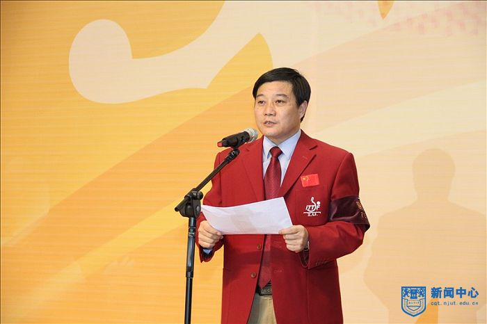 江苏省第二十届高校“董事长杯”乒乓球比赛承办高校常州大学党委书记史国栋作表态发言,表示要精心承办好下届赛事。(来自党委宣传部、体育部)
