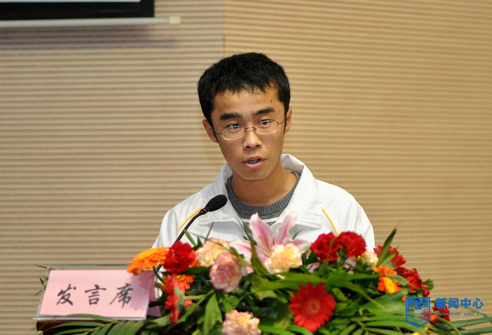 2010级高水平篮球运动员朱良同学作为新生代表表达了一定要向高年级的同学学习,继续发扬体育精神,为校园体育文化和竞技体育再创佳绩而不懈努力的决心。