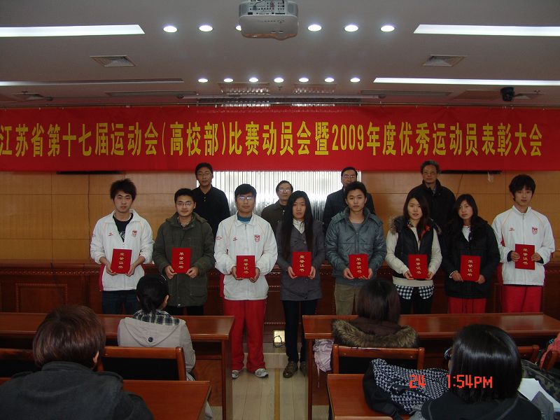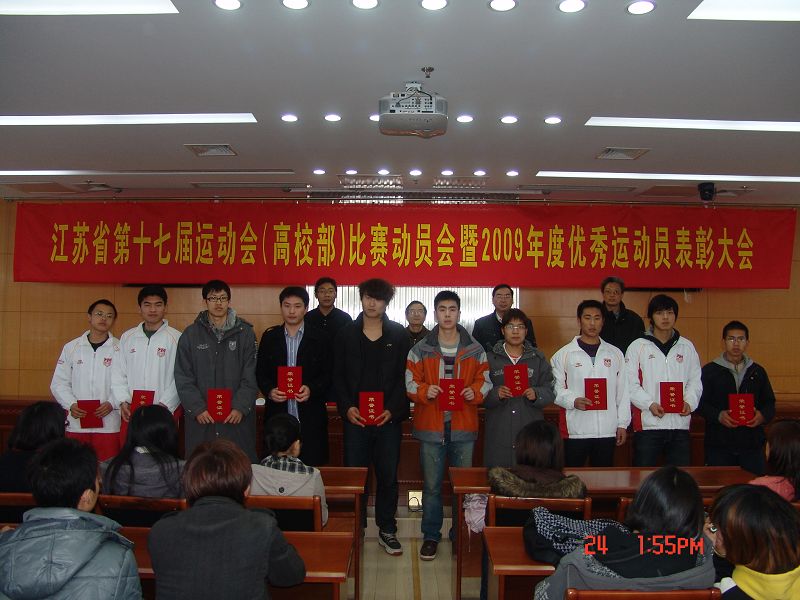 3月24日下午,体育部在江浦校区图书馆五楼会议室召开了参加江苏省第十七届(高校部)员工运动会动员暨2009年度优秀运动员表彰大会,各运动队的全体队员和教练员,体育部党政领导出席了本次动员暨表彰大会。会议由体育部副主任张天峰同志主持。