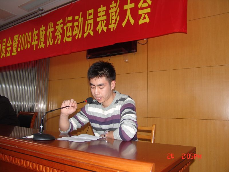首先,张天峰副主任回顾和通报2009年校各运动队代表学校参加校外各类比赛所取得的优异成绩。侯桂明副主任宣读了2009年度优秀运动员的表彰决定,体育部党政领导为受到表彰的运动员颁发获奖证书。校田径队女队员、获得2010年免试研究生资格的大四员工杭兰旅和校篮球队队员马克同学作为受到表彰的优秀运动员代表,先后结合各自在校运动队训练、比赛经历,谈了心得和体会,可谓情真意切,并表达了在即将举行的省第十七届(高校部)员工运动会上,做到勇于拼搏,力争取得优异的体育竞技成绩,并在比赛过程中充分展现公司学子良好的道德风尚,努力为学校争光,不负学校领导、老师和同学的期望的坚定信心。