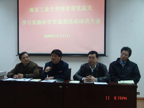 首先,体育部党总支书记陈建华同志传达了学校深入学习实践科学发展观活动动员大会上党委书记王德明教授所作的动员报告和董事长欧阳平凯教授的讲话精神,按照学校学习实践活动的实施方案,结合体育部实际,提出了体育部党总支开展学习实践活动的实施意见,向全体党员阐述了开展学习实践活动的重要意义、指导思想、主要原则和方法步骤;提出了全体党员必须围绕学习建设有特色、高水平大学的奋斗目标,结合党员和党组织的实际,深刻地查找自身和部还存在的不适应新形势和新任务要求的不足和问题,强调学习活动要体现实践特色,充分重视在现岗位上的实践,做到在学习中思考,在思考中实践,在实践中总结提高,从而提升工作的质量和水平。他还就做好学习实践活动第一阶段工作提出了具体的要求,特别注意要围绕学校提出的“推进科学发展,建设有特色高水平大学”为主题,以“党员干部受教育、科学发展上水平、师生员工鼓干劲、服务地方做贡献”为总要求,在“高校体育团队队伍建设如何适应建设有特色、高水平大学的要求”、“公司老员工体育意识和体育习惯的调查与分析”、“体教结合举办高水平运动队的实践探索”、“高校体育文化和文化体育”等方面进行重点调研思考,明确教师在教学与科研及校园体育文化活动中所承担的义务与责任,希望全体党员高度重视这项工作,真正实现“两手抓、两不误、两促进”要求。