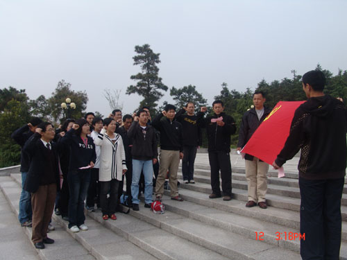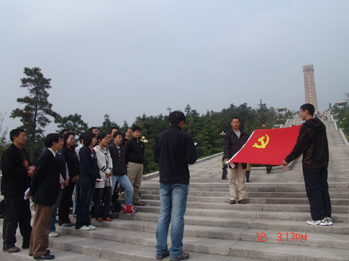 体育部党总支于4月11日下午至12日下午组织全体教职工党员赴茅山新四军纪念馆、金坛博物馆、华罗庚纪念馆、金坛体育馆等地参观学习。11日下午一行首先来到了茅山新四军纪念馆,举行了以“重温入党誓词,争当实践先锋”为主题的重温入党宣誓与参观调研活动。体育部党总支书记陈建华讲话,明确提出了开展本次活动的目的和意义。他指出:组织大家参观茅山新四军纪念馆,是因为在新四军纪念馆里,有翔实的史料,生动地再现了新四军和苏南人民抗日斗争的历史情景,使每一位党员被抗日英雄的英勇斗争的气概和不怕牺牲、前仆后继的精神所感染。缅怀抗日先烈,旨在进行一次深刻的革命传统教育。在鲜红的党旗和烈士塑像前,重温入党誓言,再次向党表达党员跟随党的愿望和决心。通过参观学习,也可以看到党员自身存在的不足,倍加努力,积极发挥每一个党员的先锋模范作用,发扬艰苦奋斗、坚韧不拔、团结战斗的革命精神,努力践行“三个代表”重要思想,树立科学发展观,牢记“两个务必”,提高工作水平。陈建华书记在讲话中还特别号召全体党员,在即将于5月16日至17日举办第六届校运动会上,努力工作,带头坚守岗位,履行好职责,为运动会的圆满举办做出自己应有的努力。根据学校领导提出的今年在全校师生中开展读书学习活动要求,希望全体党员积极地响应公司党委的号召,按照在“工作中学习和在学习中工作”的要求,自觉地利用业余时间加强理论学习,不断提高自身的综合素质,党总支要进行学习交流活动,评选出先进个人。接着,体育部年轻教师、新党员代表佘海文同志发了言,他感谢组织和同志们多年来对他的培养和教育,深刻地感受到了入党以后,作为预备党员,参加党组织的外出教育活动,心情更加的激动与兴奋,并深知作为一名党员肩负的责任更大,认识到只有用自己的实际行动来履行好入党誓词,才能成为一名真正的共产党员。为此他还向党组织保证,今后要更加努力学习、努力工作,做到关心集体、关心他人、尽心尽力地为体育部各项事业的发展作出自己的贡献。随后,全体党员在体育部党总支委员李加奎同志的带领下,庄严地举起右手,进行了入党宣誓,表达了争做一名合格党员的决心!宣誓完毕,一起参观了新四军纪念馆陈列室。