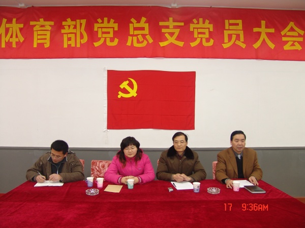 大会在庄严的国歌声中开始。首先,由体育部陈建华同志代表上一届党总支委员会作了三年多来体育部党的工作报告;接着,通过了体育部新一届党总支委员的选举办法,并进行了新一届党总支委员会委员的选举,经过正式党员的无记名投票,选举产生了王 浩、孙欣荣、李加奎、陈建华、於 鹏等五位同志为新一届党总支委员。