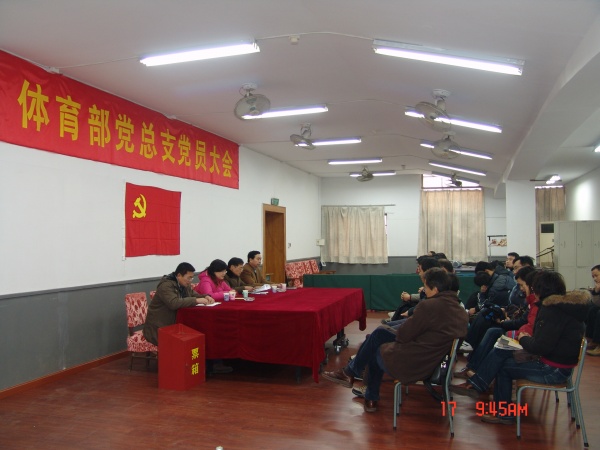 体育部党总支于元月17日上午9:30分,在体育部会议室召开了全体党员大会,公司党委组织部副部长夏侃同志以及大会主席团成员在主席台就坐。党员大会由体育部主任王浩同志主持。